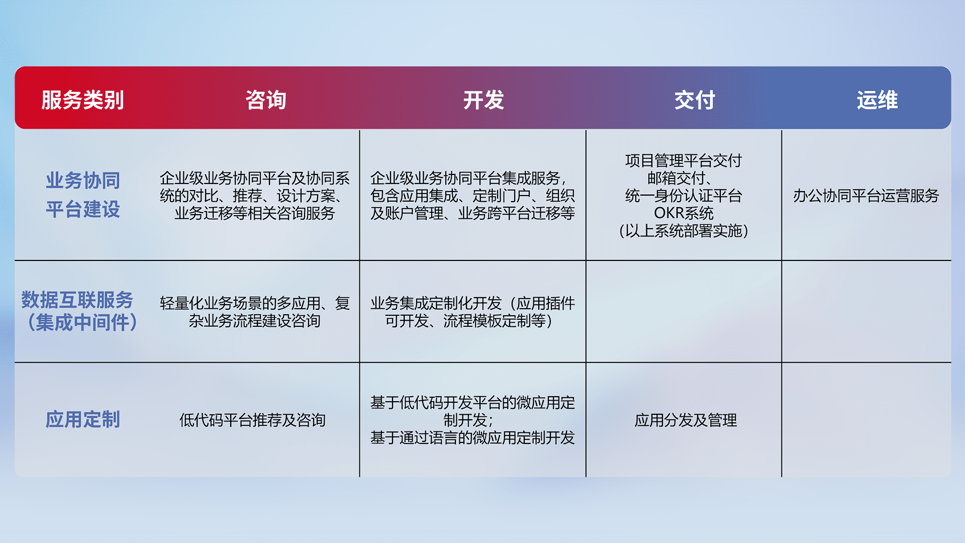 针对钉钉、、企微、、、IDaas等平台级产品提供产品的规划、、、方案、、交付、、定制化开发等服务,,实现如统一协同办公、、、、智能客户服务、、、、混合会议管理、、、、智能数据查询、、等业务场景,,实现数字化转型。。。。